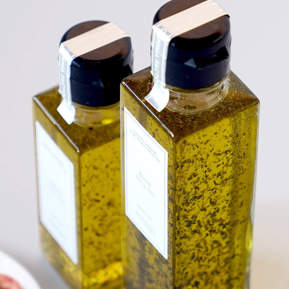 オリーブオイルは素材の香りが移りやすいため、質の高いフレッシュなスイートバジルを厳選し贅沢に使用しました。濃厚で爽やかなスイートバジルの風味をお楽しみください。